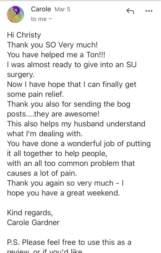 I shared with her the road map that I myself discovered for stabilizing the SI joints, and am now using to help my clients find their way forward.