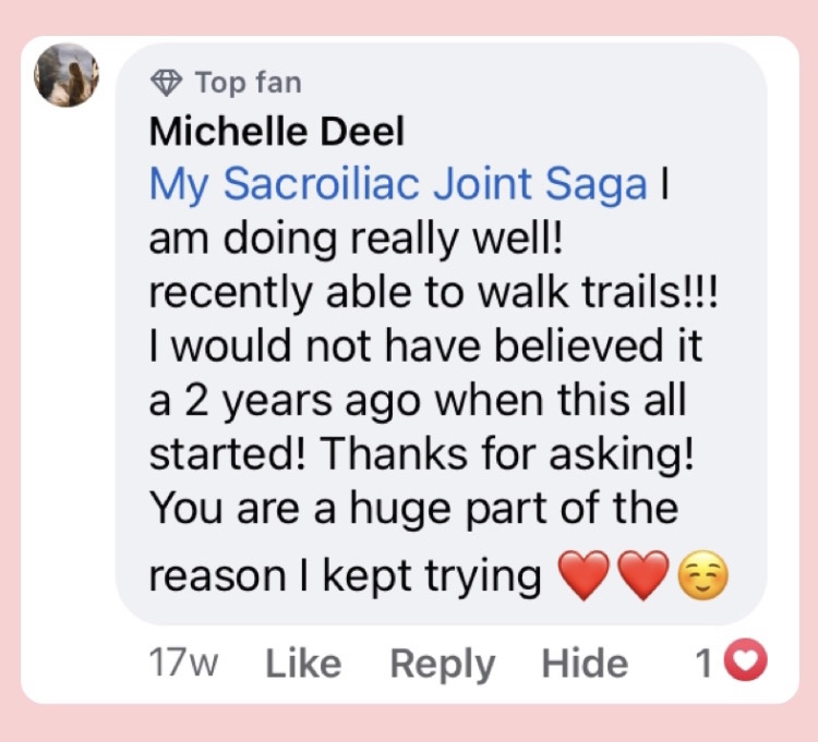 You were super helpful in our call together Christy! I was able to better understand SIJ issues and have the right terminology to ask the right questions of PTs and doctors. Thank you so much for that!